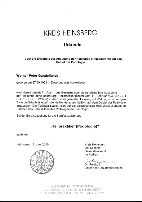 Herr Werner Gandelheidt ist jetzt auch Heilpraktiker im Bereich der Podologie.